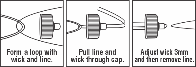 Carefully remove wick from lamp, torch or lantern and fill with appropriate filling equipment such as a small funnel or a squeeze bottle with tube nozzle. Ensure that the wick is 3-5mm visible. The more visible the wick, the higher the flame. The higher the flame, the brighter the light. Keep wick short to avoid excessive burning. Excessive burning reduces burning hours. A 3-5mm wick will burn for 80 hours. Allow new wick 5 minutes to absorb oil. Avoid spillage and wipe off any excess before lighting.